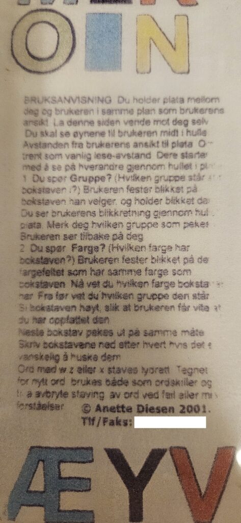 - Du spør: Gruppe? (Hvilken gruppe står bokstaven i?) Brukeren fester blikket på bokstaven hen velger, og holder blikket der. Du ser brukerens blikkretning gjennom hullet i plata. Merk deg hvilken gruppe som pekes ut. Brukeren ser tilbake på deg.