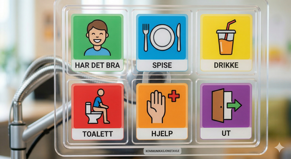 Til venstre ser vi et eksempel på en øyepeketavle med et 2×3 grid og piktogrammer. Disse kommer i utallige variasjoner, er lett tilgjengelige og kan individuelt justeres etter ønsker og behov. Bildet er konstruert med kunstig intelligens for ikke å bryte regler om opphavsrett.